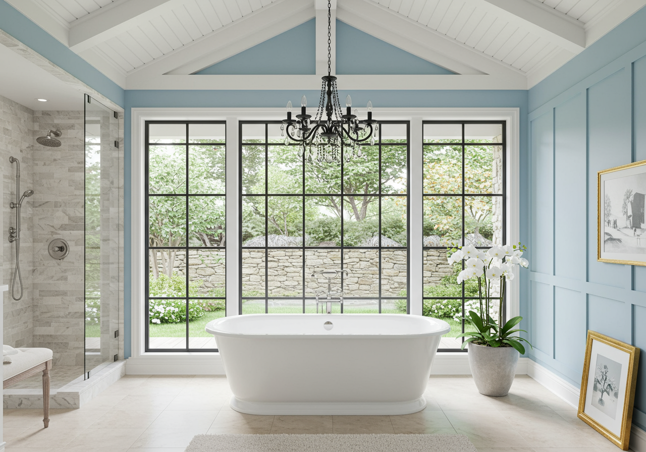 Use this shade of blue as you would a neutral, painting walls or ceilings with the light blue, and accenting with light, earth-tone accents. Or use the cool hue on an accent wall to make wainscoting or wall paneling pop without overwhelming the space.