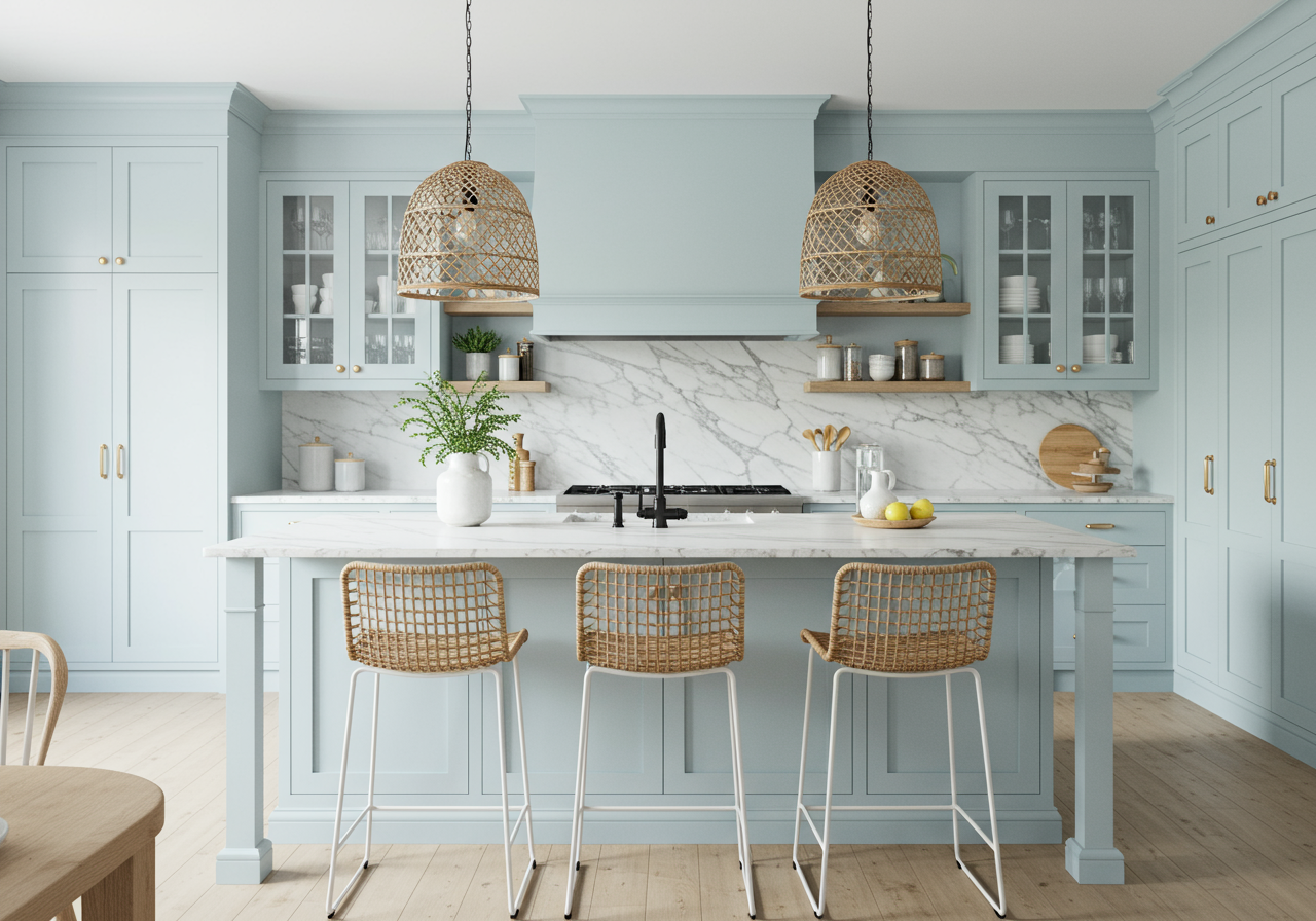 Utilize Renew Blue in a bathroom with coastal accents, like a jute runner or driftwood accessories, to create a seaside escape. Or pair it with bright white in the kitchen for a crisp, clean look with the perfect pop of color.