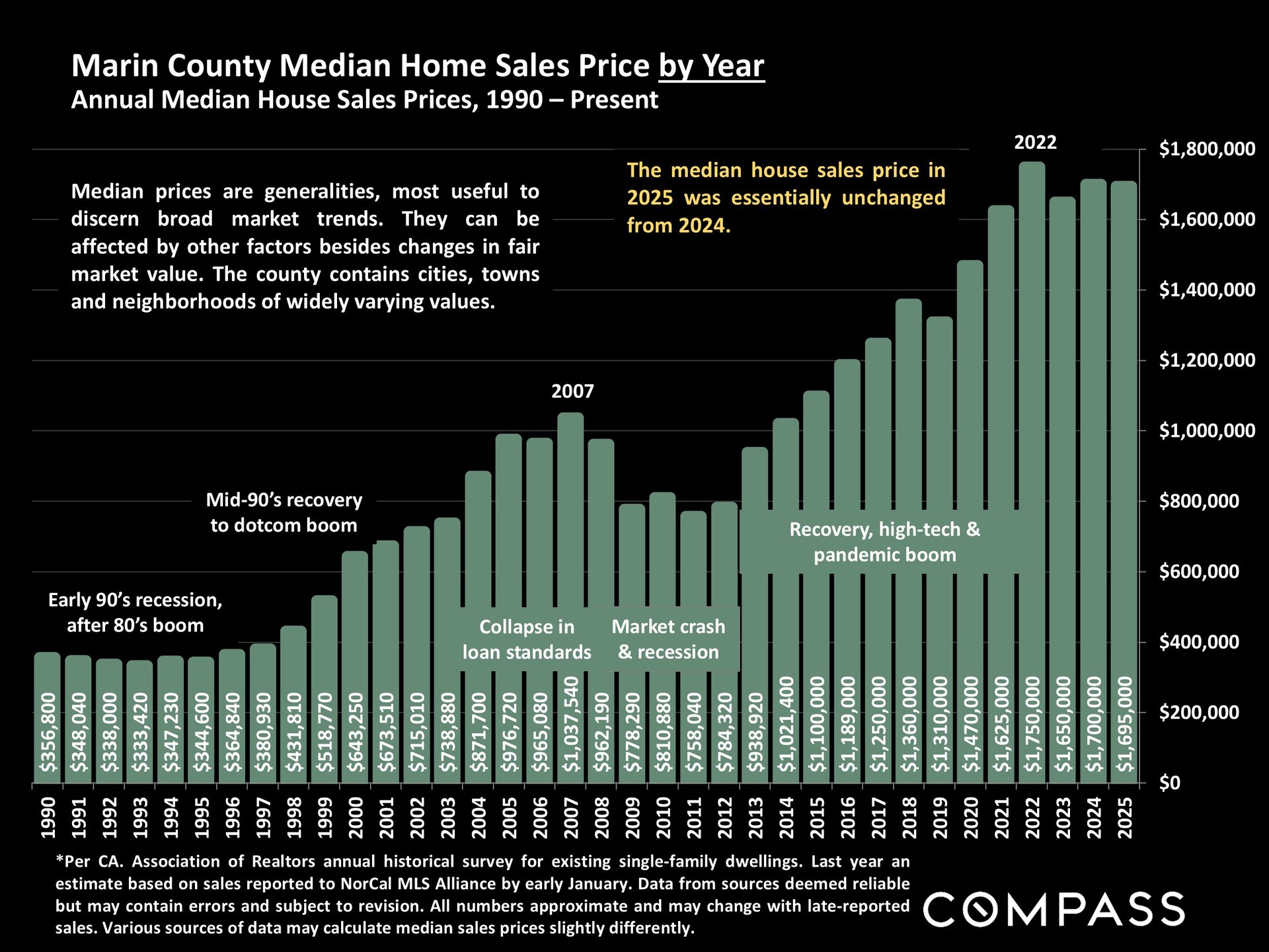 Marin County followed a more measured—but still resilient—trajectory in 2025. Like San Francisco, the year began with strong buyer interest before early-spring uncertainty cooled activity. As financial markets stabilized later in the year and borrowing costs eased, buyer psychology began to shift again.
