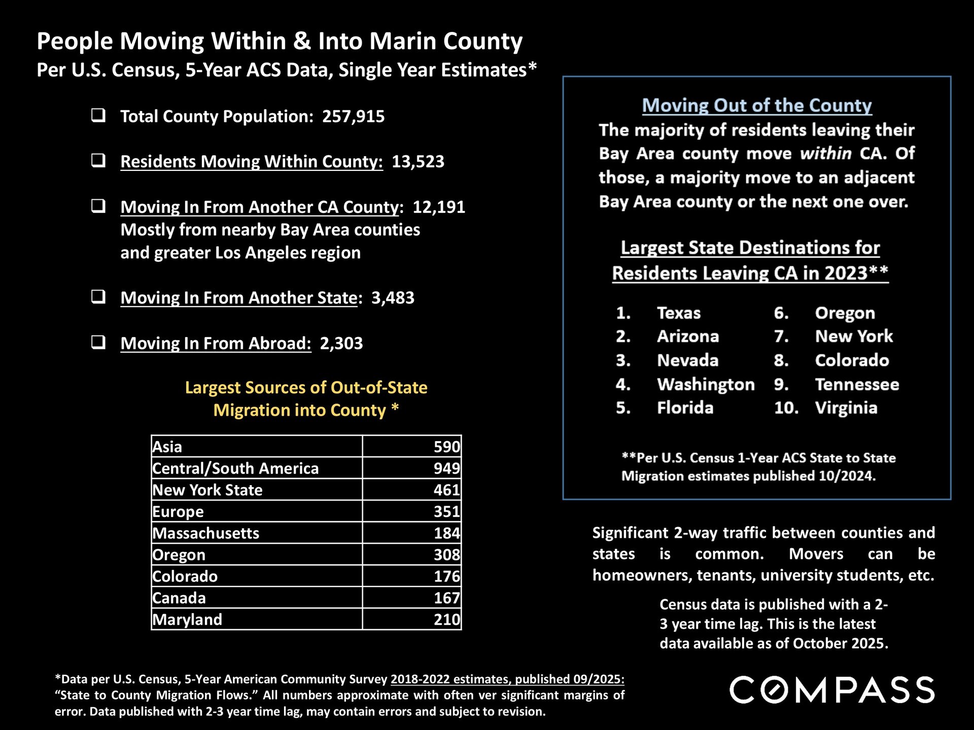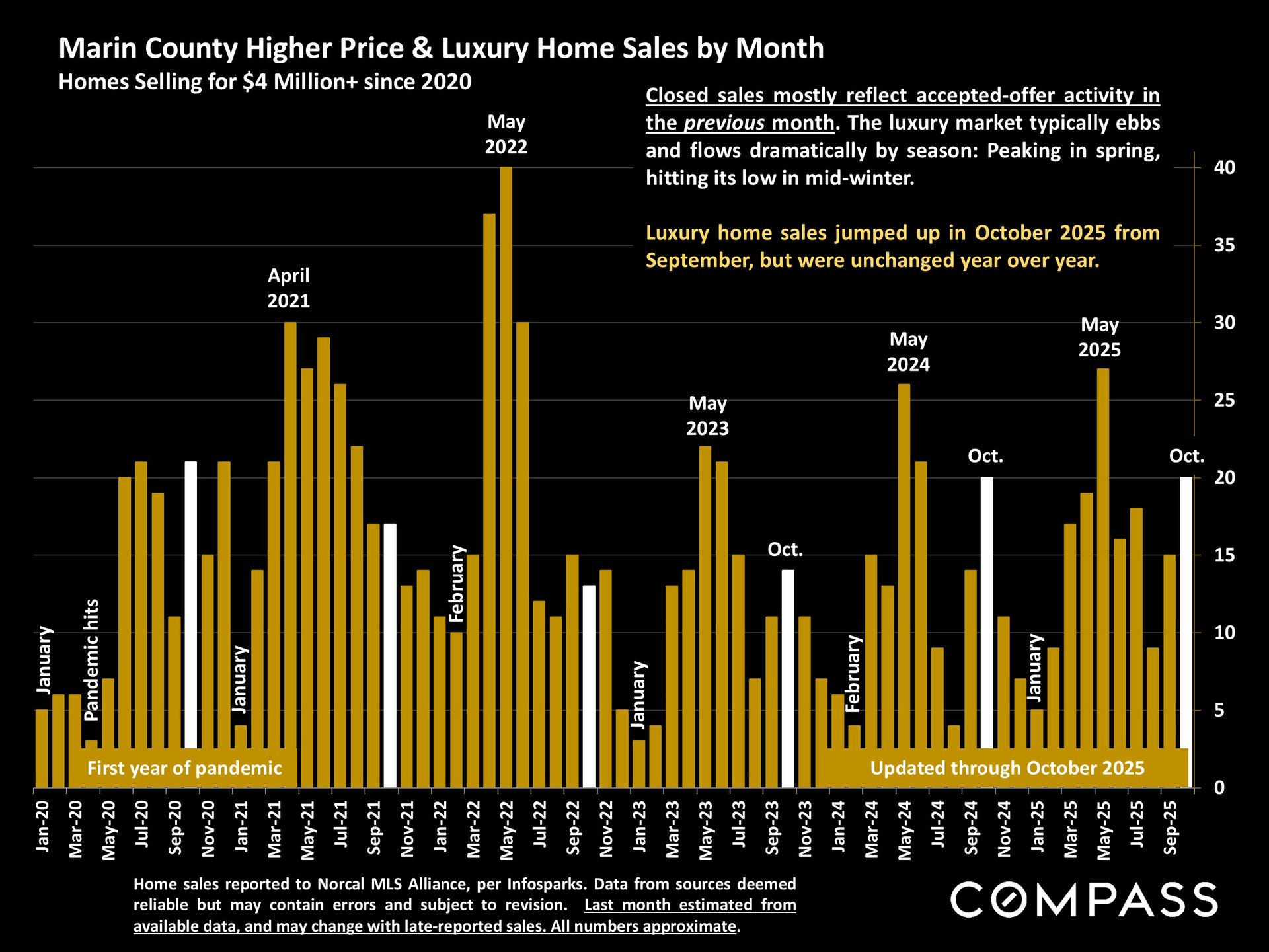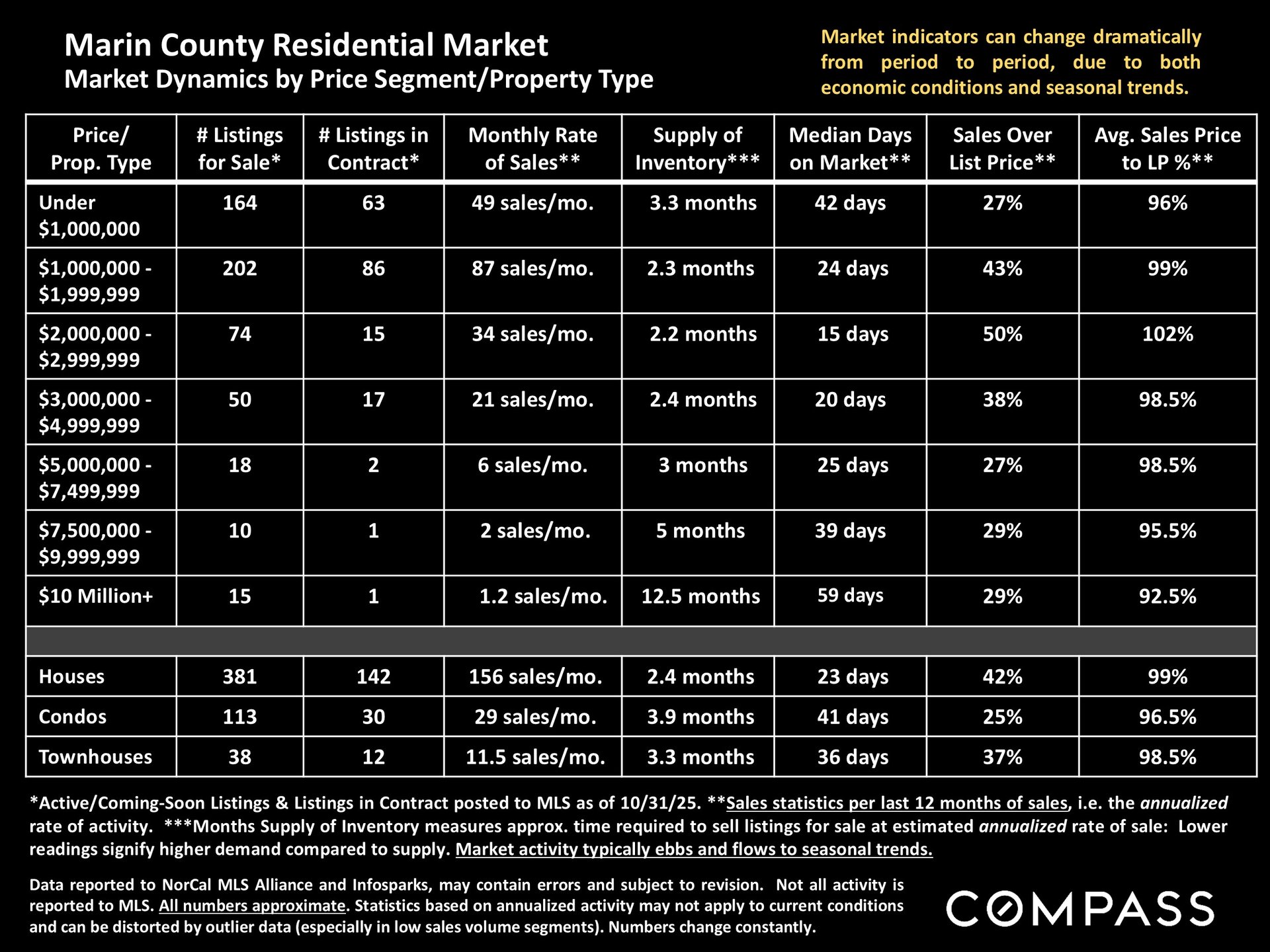 Marin County’s real estate market mirrored San Francisco’s momentum in October 2025. The S&P 500 and Nasdaq climbed to new highs, mortgage rates hit a yearly low, and inflation ticked slightly upward to 3%. The Fed’s second rate cut of 0.25% this year brought renewed optimism, though uncertainty remains for the December meeting. Consumer confidence remains tempered, with economic concerns persistent, but affluent buyers are buoyed by their market gains.